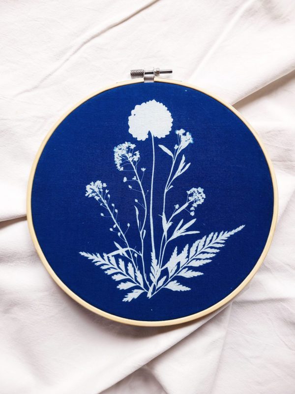 la aplicación del cianotipo con pincel, la elección de la luz y la textura del tejido.