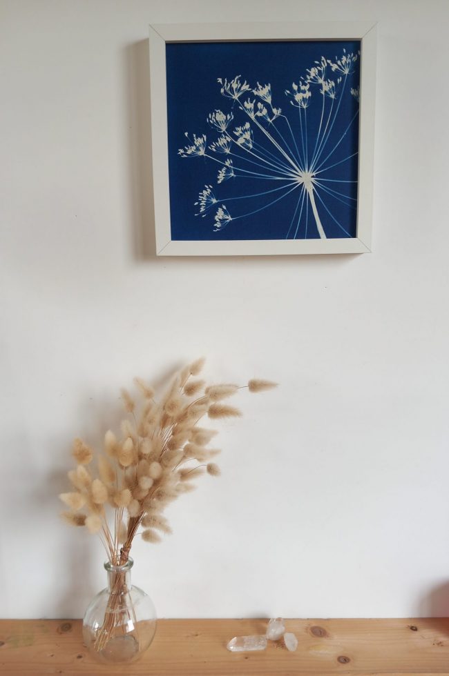 Aunque haya varias impresiones de una misma fotografía, cada impresión es única, original y creada artesanalmente. Todo el proceso es manual: la aplicación del cianotipo con pincel, la elección de la luz, la textura del papel i los virados. Los baños para el virado de la fotografía están creados con elementos naturales como plantas, té, café, etc., que me permiten teñir el papel y obtener alteraciones en el azul, dándole así un aspecto antiguo y distinguido a la fotografía.